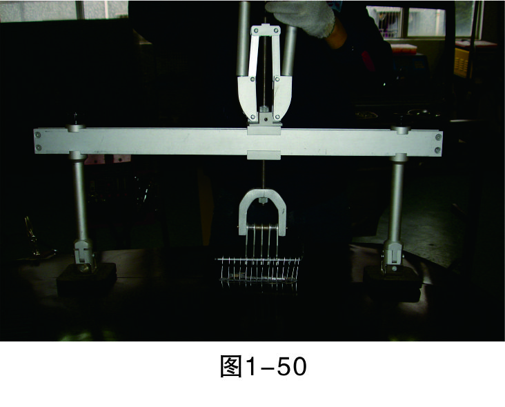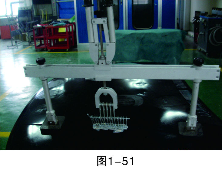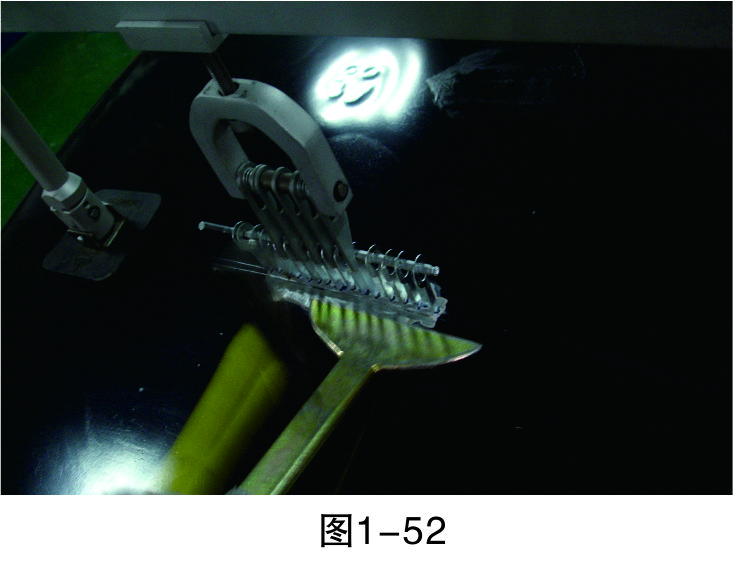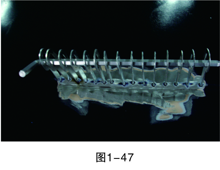 步驟6(穿進L形鐵):在介子中穿入L形鐵,以便整形架的拉鉤能固定在上面進行拉伸作業,如圖1-47所示。