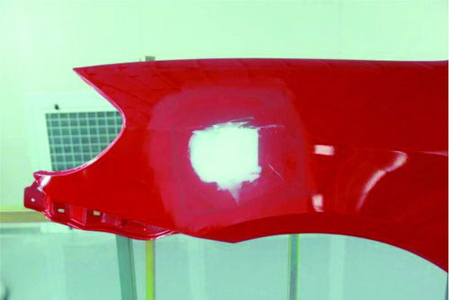 ②指刮法。在原子灰干燥過程中,可以用手指甲輕輕地刮原子灰邊緣薄的部分,檢查原子灰是否已經干透。如果沒有干透,則在指甲上會粘有原子灰;如果已經干透,則指甲不會粘上原子灰,并在原子灰上出現堅硬的白色痕跡。如圖2-53所示。