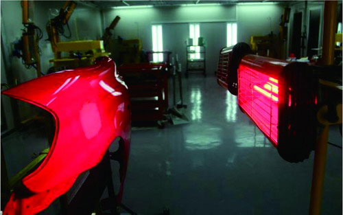 ②紅外線干燥。如果環境溫度太低或者空氣濕度太大,原子灰干燥固化速度就會減慢。為了縮短原子灰的干燥時間,可以借用干燥器或者是紅外線烤燈加熱原子灰進行干燥。一般烘烤時間設定為10min左右,在烘烤過程中,要不斷檢測板件的溫度,并檢查原子灰是否已經干燥。如圖2-51所示。