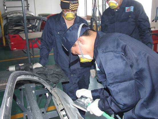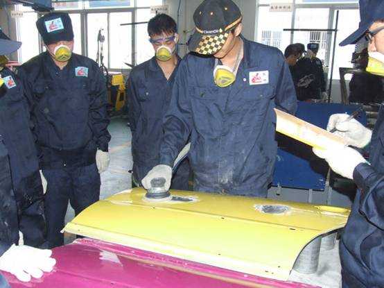 老師們使用鈑金工具套裝進行修復(fù)車身的練習(xí)