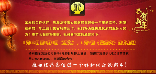 2014年春節放假通知 2014-01-16 10500 親愛的合作伙伴,珠海龍神衷心感謝您在過去一年里的支持,期望在新的一年里我們更密切的合作,我們將為提供更優質的服務而努力!春節長假即將來臨,我司春節放假通知如下:1月26日至2月8日(初九),2月9日(星期六)正式上班。特別提示貨運公司將于1月25日后停止發貨,如需訂貨請于1月25日前傳真至0756-8509650,謝謝您的合作!最后祝愿各位過一個祥和快樂的新年!