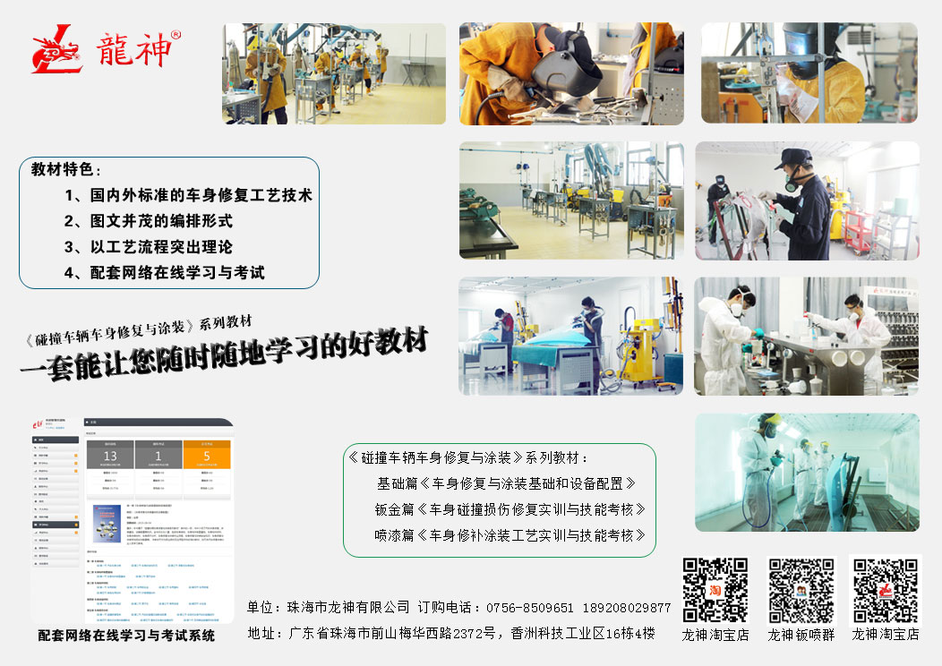龍神隆重巨獻“汽車鈑金修復與噴漆”系列教學實操教材 2014-07-10 70470 珠海市龍神有限公司2014年隆重巨獻《碰撞車輛車身修復與涂裝》系列教材:基礎篇《車身修復與涂裝基礎和設備配置》、鈑金篇《車身碰撞損傷修復實訓與技能考核》、噴漆篇《車身修補涂裝工藝實訓與技能考核》。 本系列教材,根據國內職業教育的要求,在內容上加強了針對性和應用性,力求把傳授知識點與能力培養有機地結合在一起,突出以能力為本位的職業教育特點,體現理論與實踐相結合的一體式教學模式。本教材教學體系及教學模式先進,文字通俗易懂,插圖清晰直觀。每冊配贈網絡學習、在線題庫。可作為職業院校及本科相關專業教材,也可供洗車維修涂裝叢業人員學習和參考。 《碰撞車輛車身修復與涂裝》系列教材,現已啟動全面征訂!