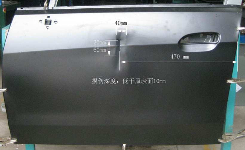 2013年車身修復大賽受損門板修復項目技術方案的補充說明 2013-05-16 18871 2013年車身修復大賽受損門板修復項目技術方案的補充說明 1、受損門板項目的受損位置及尺寸圖片、作業要求(1)作業要求在40分鐘內,對雪佛蘭新賽歐左前門外板上的長80mm,寬40mm,深10mm的條形凹陷(漆膜已破壞)進行修復,凹陷損傷穿過車身線。