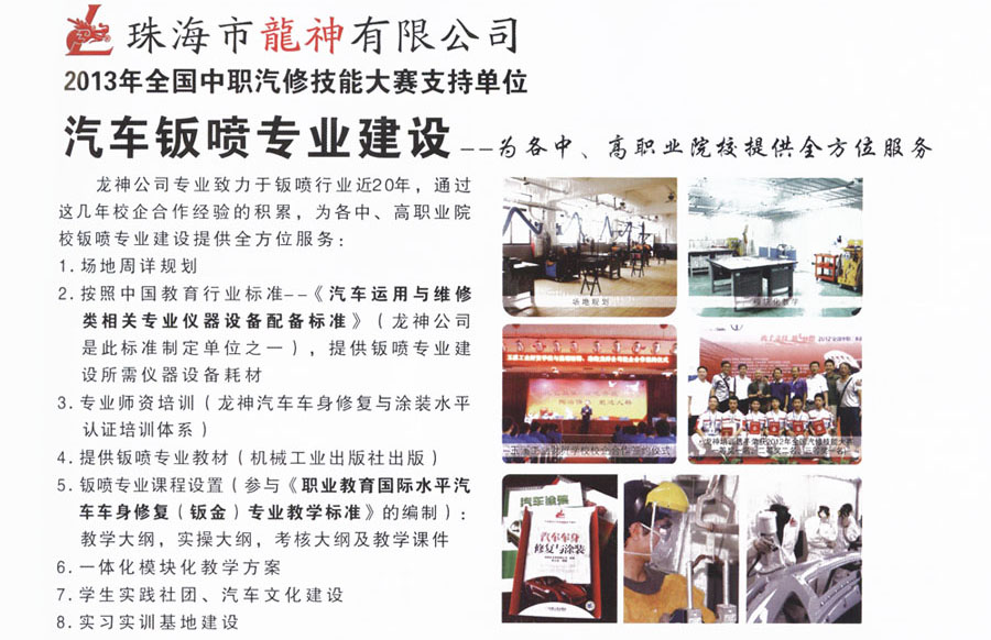 “龍神杯”2013年河南省中職學校汽車專業技能涂裝項目大賽 2013-03-28 26351 “龍神杯”2013年河南省中職學校汽車專業技能涂裝項目大賽 3月22日,2013年河南省中職學校汽車專業建設-校企合作專家論壇暨2013年汽車專業技能大賽開幕,珠海市龍神有限公司王先生出席開幕式并演講“龍神鈑金一往情深”。在本次大賽中龍神系列產品做了高率、環保有力的保障了賽事的進程,同時也受到了參賽學校的一致好評。 3月24日,“龍神杯”2013年河南省中職學校汽車專業技能涂裝項目大賽圓滿結束。
